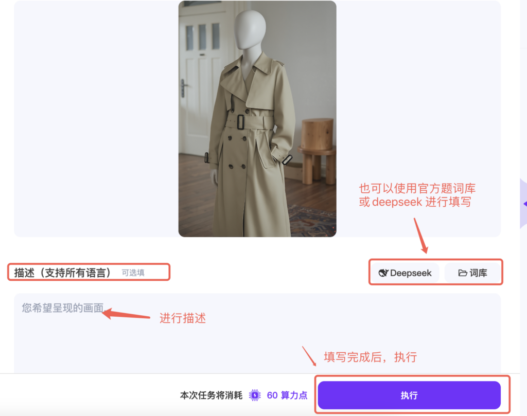第一步,将咱们生成的人台图发送到【换姿势】中,进行描述想让人台模特生成的姿势,执行即可,非常简单,好操作。