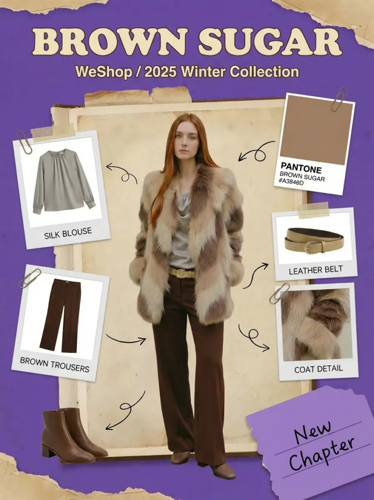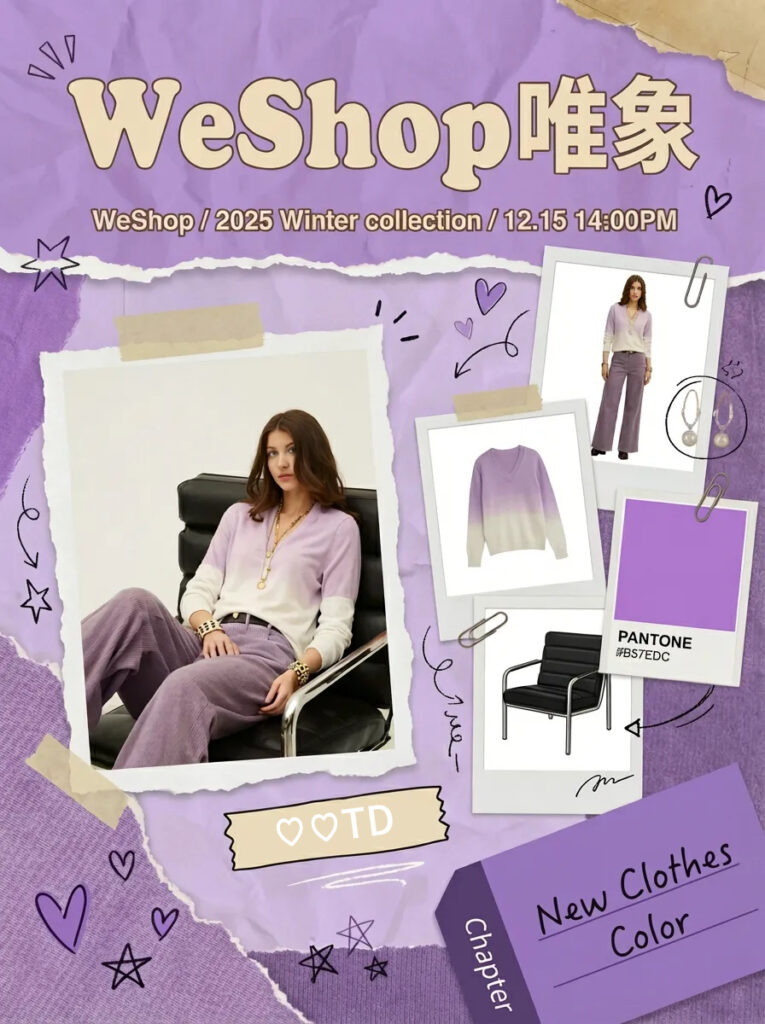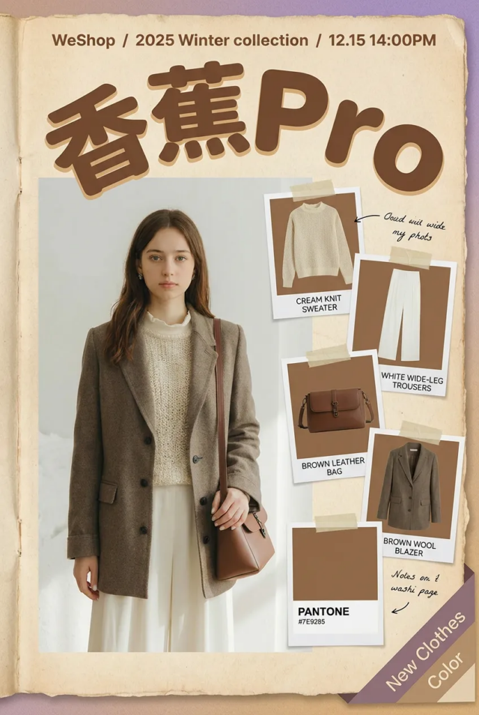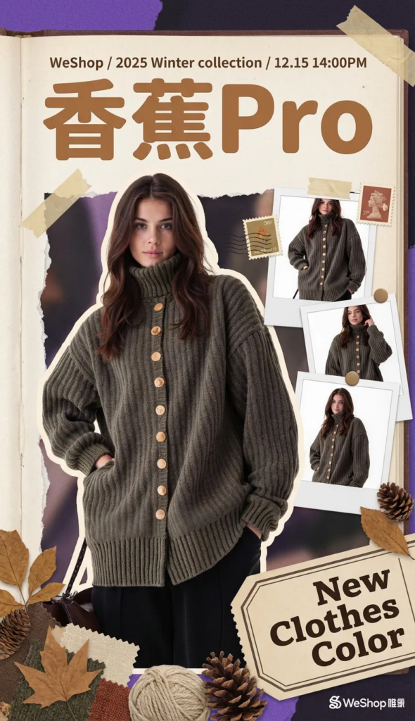 - 生成一张偏手账拼贴感的时尚海报,整体气质温暖又文艺,带有明显的 Lookbook / 冬季系列发布 属性。 画面以【xx色调】为主背景色调,像翻开的纸质画册,顶部以弧形大字写着 “【标题】”,字形圆润厚实,强化了复古与亲和力。上方小字标注 “【小标题】”,明确传达这是一个以自然为灵感的冬季系列发布。 画面中心是【图x】半身女模特主视觉: 右侧以拍立得照片拼贴的形式呈现图1的拼贴 右下角以斜切色块标注 “New Clothes Color”,既像标签又像章节页签,强化新品发布与内容感。 整体视觉总结: 这张海报将复古针织、自然色调、学院文艺气质与年轻化拼贴设计结合,既有品牌调性的沉稳,又具备社交媒体传播友好度,非常适合作为 冬季系列 Lookbook 首图 / 新品主视觉 / 社媒封面。