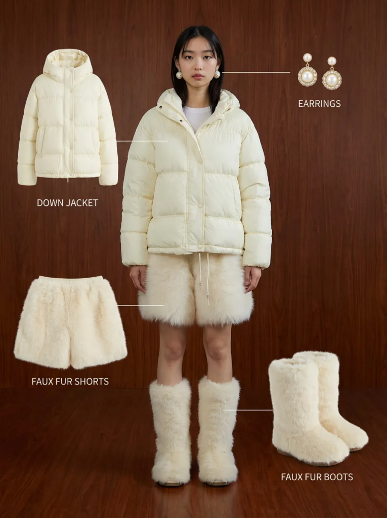 - 四周:单品平铺或悬浮展示(服装拆解图)单品旁有英文标注