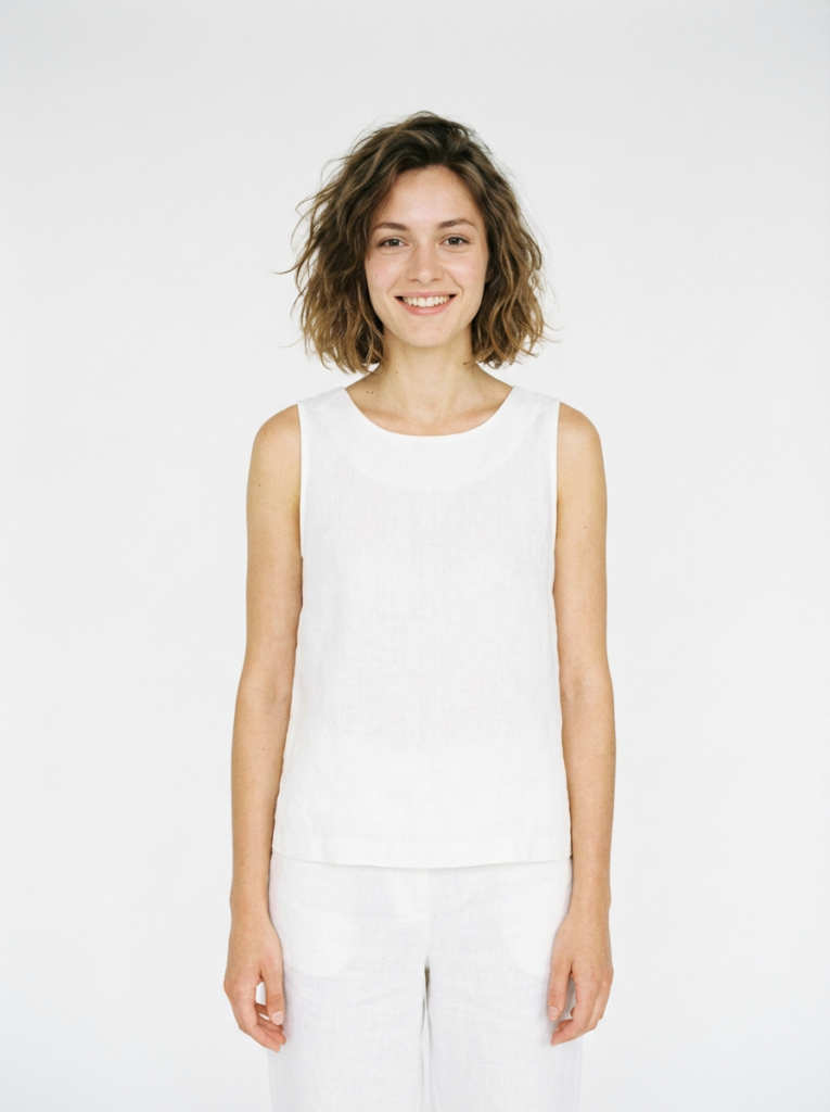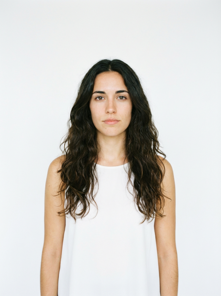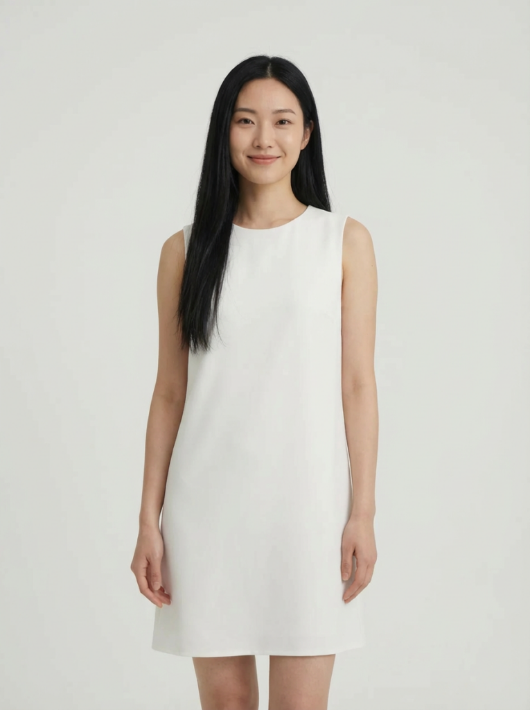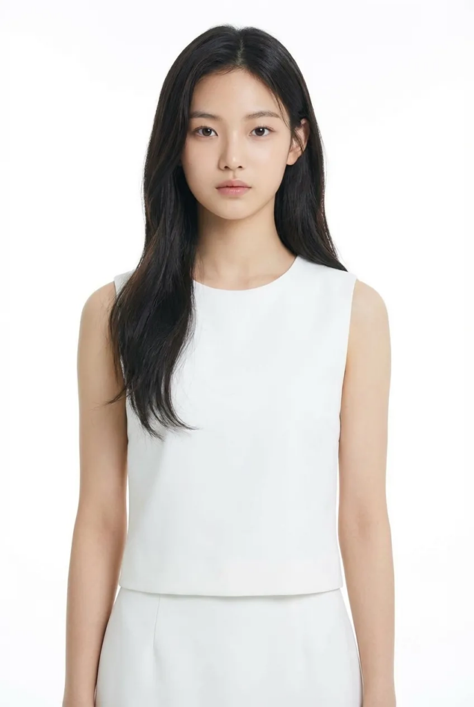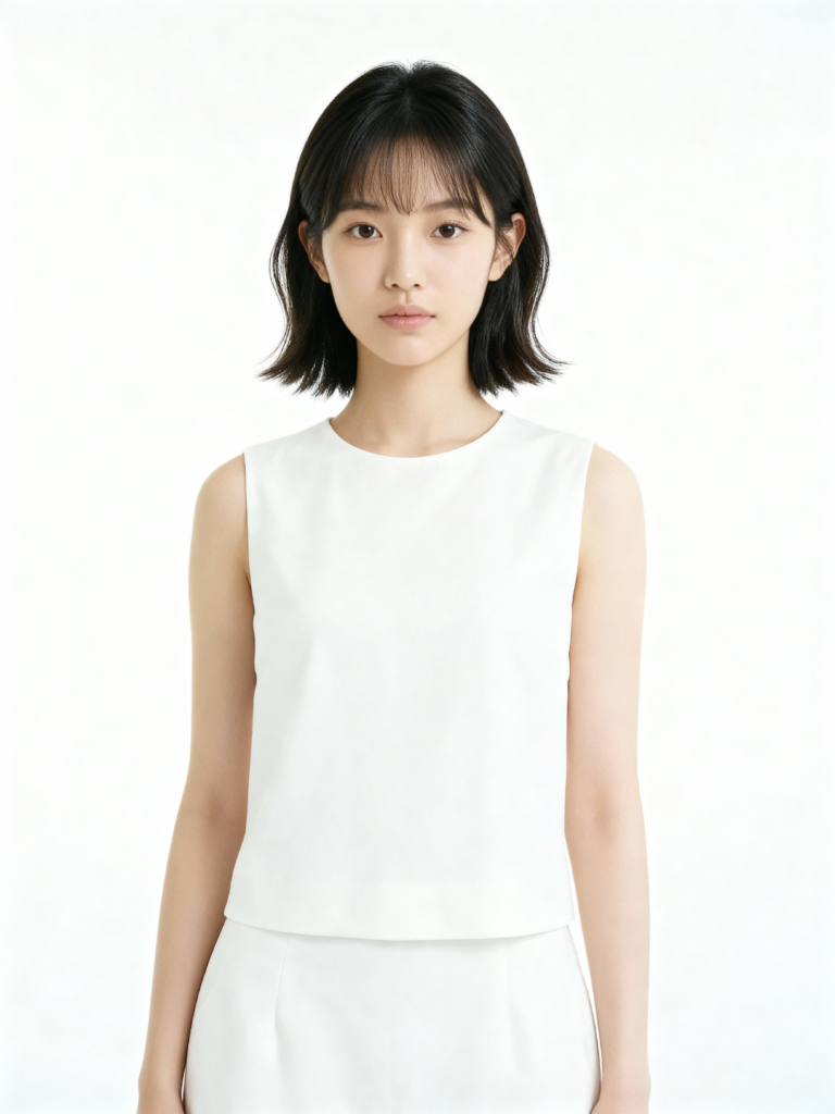 文案:请生成一张逼真的肖像照,照片中是一位留着黑色长发的亚洲女性,身着纯白色无袖上衣,背景为纯白色。