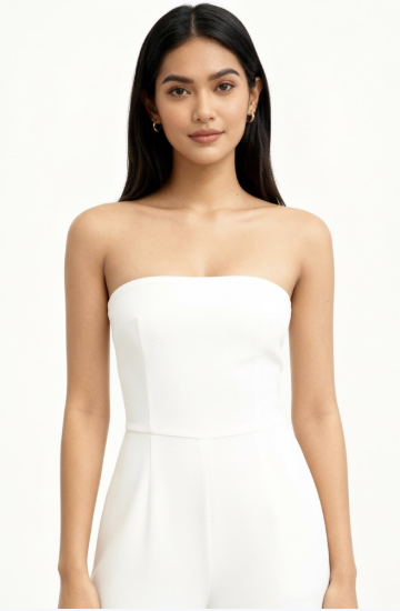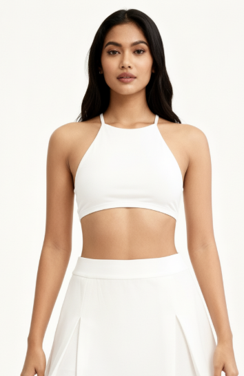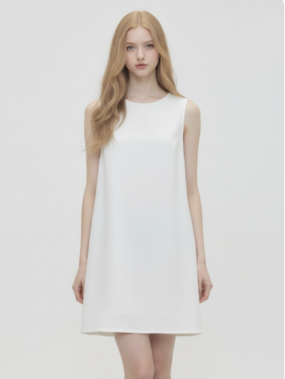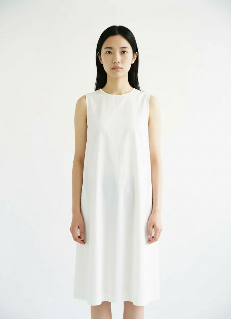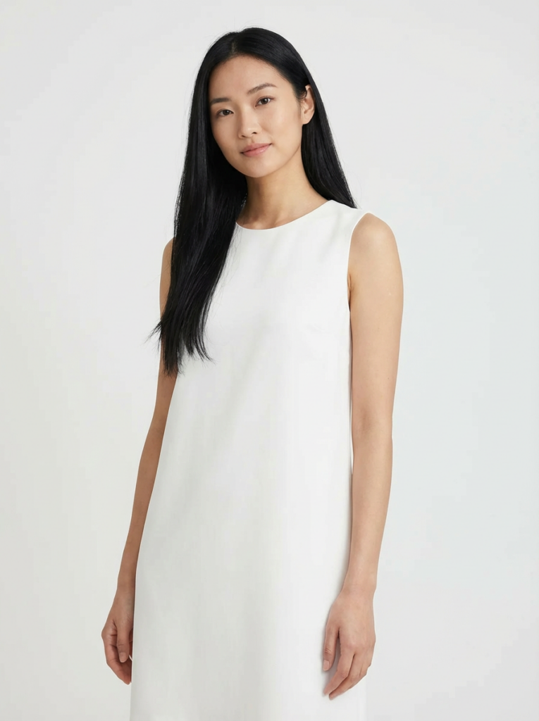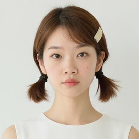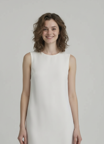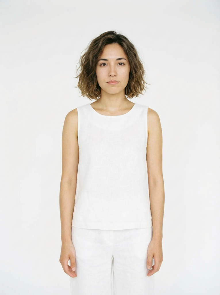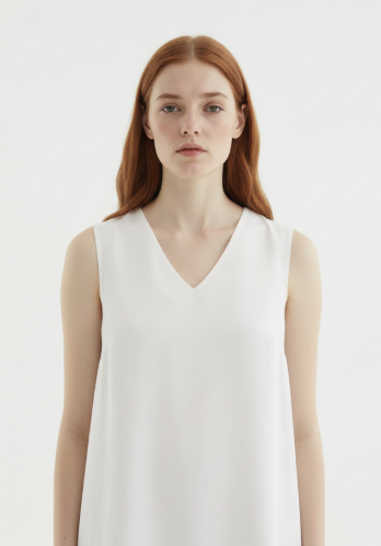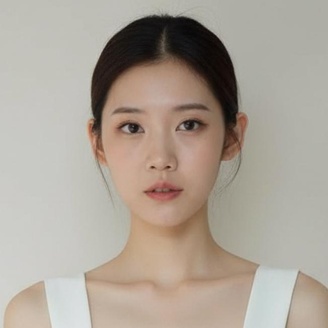 文案:请生成一张逼真的肖像照,照片中是一位留着黑色长发的亚洲女性,身着纯白色无袖上衣,背景为纯白色。