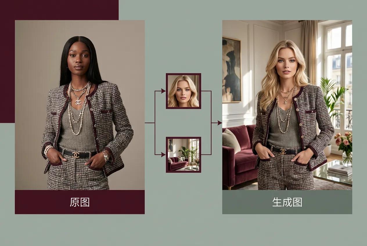 「换模特换背景」,快速生成效果真实、媲美实拍的商业图像,出图快、成本低,即刻重塑您的视觉生产力。