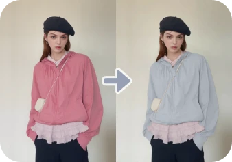 基于 AI 色彩重构技术,实现多类商品的多色快速生成。支持服装、鞋履及各类商品的精准换色,保持材质质感与光影一致性。内置智能配色库及官方标准色系,助力品牌高效完成多款展示与上新。